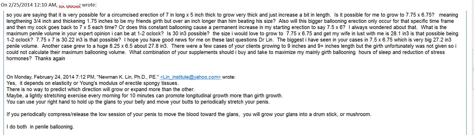 This means: if you the smooth muscle can be safely stretched up to about 10% without concerning muscle plasticity while the mechanical stimulation can help the smooth muscle grow. Penile ballooning produces 140% volumetric increase which is about 12% linear increase ( length or girth): Volumetric measurement = 1.12 x 1.12 x 1.12 = 1.40 times. Some people gains more on length than in girth. The most common result is: the length gains 20% (1.2 times), and the girth likely is1.08 times bigger (about 8% increase).