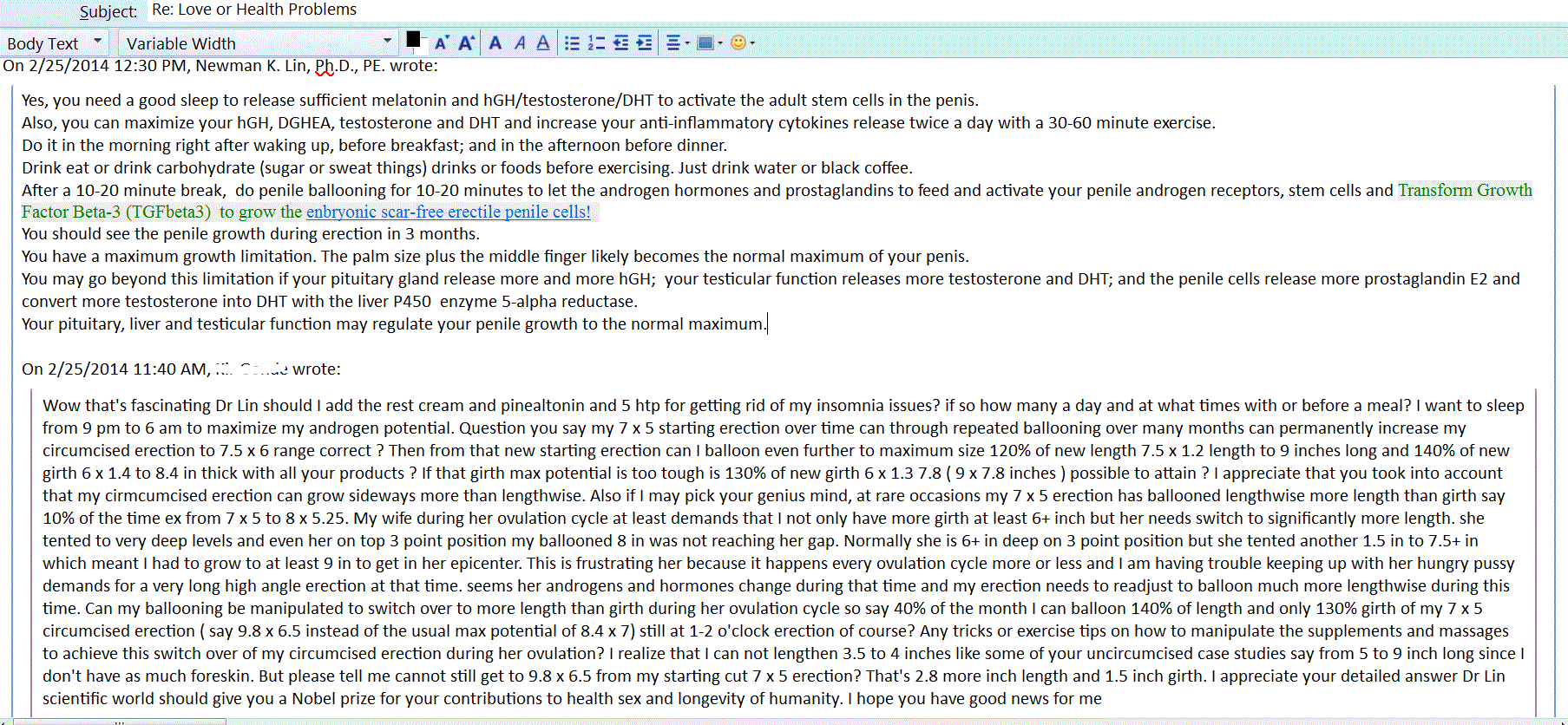 The best time for self practice of penile ballooning is in the morning upon wakeup and still in the bed when the bloodstream contains a high level of androgen hormones and HGH without external stress. Generally, you can practice penile ballooning in any positions; a supine or sitting relaxation position is better than a standing position although I usually prefer a semi-squatting (horse-riding) position with a body-weight loading on the leg muscles and joints. However, jumping out of bed or standing up may result in quickly going limp by redirecting the blood flow from your penis and testicles to your skeleton muscles and joints to support the body weight for some androgen-deficient men. In this regard, he will have to boost androgen hormone level first. Spontaneous erection is essential to penile ballooning. Natural spontaneous erection can occur when androgen hormones, HGH, and dopamine function run high without external stress upon the morning wake up, and when oxytcoin (requiring a dopamine nervous burst) runs high with stress hormone norepinephrine acting on the sympathetic nervous beta-adrenergic receptors during lovemaking with a testosterone and DHT level over 500 ng/dl and 50 ng/dl, respectively. Both occasions are the best time to practice penile ballooning. However, HGH is essential to activation of the stem cells in the erectile tissues for regrowth with prostaglandin E-2 while release prostaglandins E1 and E3 and nitric oxide are necessary for penile tissue and nervous relaxation and flexibility. All the chemistrial factors are to activate gene Cytokeratin 16 and Transform Growth Factor Beta-3 (TGFbeta3) for fine-tuning or suppressing pain and inflammatory responses as well as for avoiding collagen protein release that leads to scarring penile erectile tissues, nerves and blood vessels for deformation and erectile dysfunction as common results of mechanically penile stretching, pumping and weightlifting. Excessive prostaglandin E2 and stress hormone norepinephrine are the common factors for stimulation of the collagen protein release. Don’t be fooled by temporary penile tissue inflammation due to excessive prostaglandin E2 and stress hormone norepinephrine as penile enlargement. It is a sign of penile tissue hardening for erectile dysfunction.