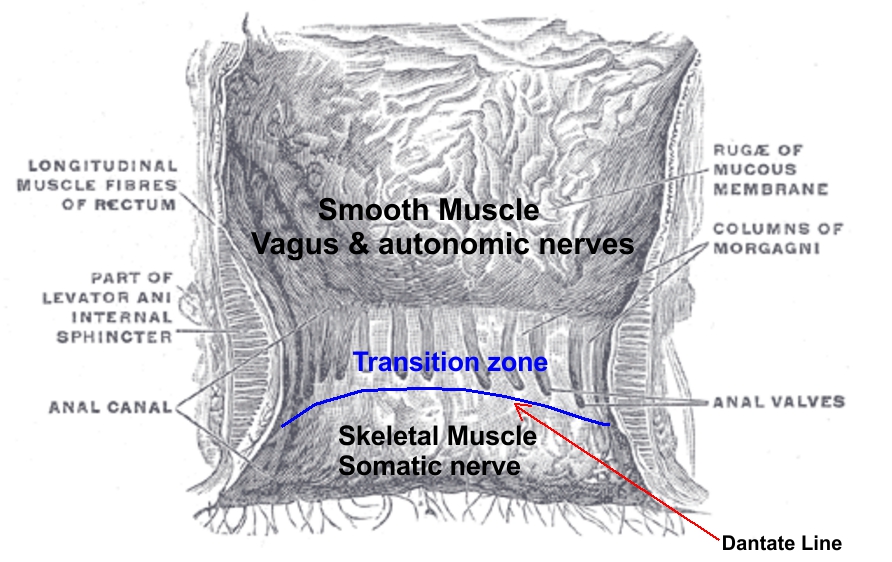 About 0.5-1.0 inches Inside the vagina or anal cavity, the skeletal muscle and the smooth muscle meet together. In the vagina canal, the meeting (cross-talk) zone is called the G-spot, and in the anal canal, it is called Dantate Line with a transition in Anal Columns of Morgagni.  In side the vaginal canal, the vagus and autonomic nerves are inside the epithelium of the smooth muscle. In the anal canal, if you massage the front side of the anal transition zone against the acupuncture point huì yīn會陰, you will directly stimulate the vagus nerve via the adjacent reproduction organs as well as the inferior hypogastric nerves (mainly from the spinal nerves L1-L3, lumbar sympathetic nervous plexus) , and the splanchnic nerves (sacral parasympathetic nervous plexus) and the pudental nerves (the sacral somatic nervous plexus for skeletal pelvic muscle around the anus, testicle suspension ligament, and vagina along with the sympathetic fibers to the smooth muscle in the testicles, clitoris and penis ) that  originates from the lumbo-sacral plexus (lumbar L4 and sacral S2-S4). Massaging the back of the anus toward the acupuncture point cháng qiáng 長強 stimulates the splanchnic and pudental nerves that arise from sacral spinal nerves S2-S4. The stimulation of the autonomic nerves (parasympathetic nerves from sacral sections S2-S4, and sympathetic nerves from lumbar discs L1-L3) in the epithelium of the anal canal transitions, from colonic and rectal simple columnar epithelium to stratified squamous epithelium, can also release prostaglandins and nitric oxide to excite the vagal sensory nerve in the lower section of colon, known as the sigmoid colon transitions into the rectum. A deeper stimulation of the anus-rectum can directly activate the vagus nerve and inferior hypogastric nerve in the smooth muscle of the sigmoid colon transitions. However, the direct stimulation can damage the rectum lining. Noticeably, the average length of the human rectum may range between 10 and 15 cm, about the averaged penis length. For this reason, anal sex lets some women experience powerful orgasms as a result of the direct vagus nerve stimulation on the sigmoid colon transition. A gentle, shallow anal stimulation relies on the cros-stalk among prostaglandins, nitric oxide, neurohormones and nerves to achieve VNS in the internal genital organs or the sigmoid colon transition.