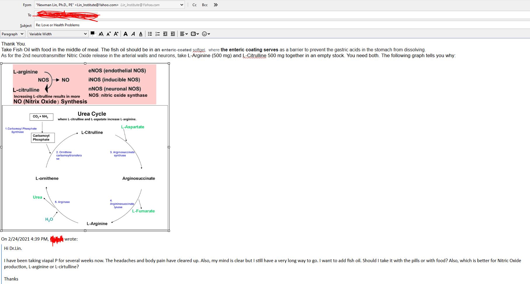 I have been taking viapal P for several weeks now. The headaches and body pain have cleared up. Also, my mind is clear but I still have a very long way to go. I want to add fish oil. Should I take it with the pills or with food? Also, which is better for Nitric Oxide production, L-arginine or L-cirtulline?