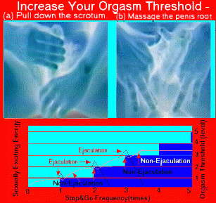 If you are not ready to ejaculate, stop your sexual action before your sexual energy passes through your orgasm threshold level. Once you practice Item 8 your orgasm threshold will be one step higher than before. When the orgasm threshold reach an absolute maximum which may be far above your sexually exciting energy, your penis becomes numb and no ejaculation will occur. This can occurs when you practice Item 8 four or five times in one love session. Is this what you want? |