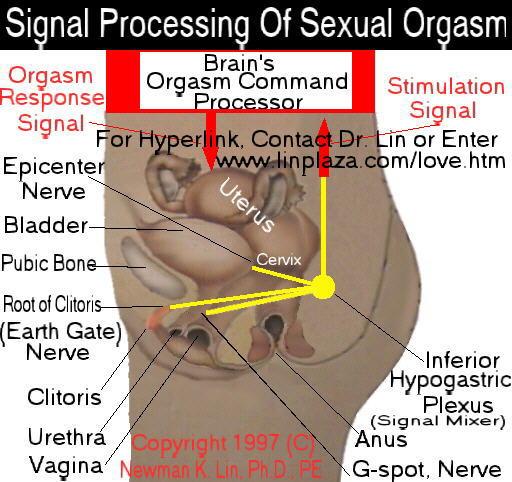 The easiest way for the resonant excitation of multiple orgasms is to simultaneously apply pressure waves to the clitoris, G-spot and Epicenter. You may wonder why. In fact, the Method of Resonant Excitation, which enables a couple to do so, allows the sexual nerves "in" these three spots to register the stimulation signals constructively superimposed in the signal mixer, the Inferior Hypogastric Plexus. The following graph illustrates the control circuit of sexual orgasm.